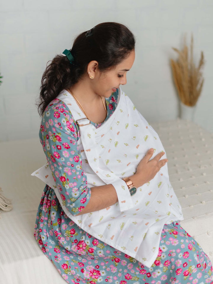 The FIRSTIN Printed Poplin Feeding Apron designed to make feeding time easier and more enjoyable for both mom and baby.
