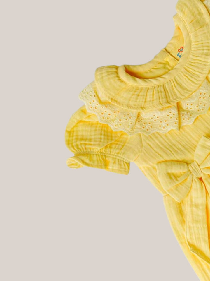 Dress your little one in pure comfort and timeless charm with our Muslin Bubble Crinkle Frock, designed with delicate frill details and a sweet bow accent. Made from ultra-soft 100% muslin cotton, this frock is breathable, lightweight, and gentle on sensitive skin—perfect for all-day wear.