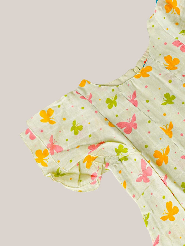 Let your little one stay stylish and comfortable with the FIRSTIN Muslin Butterfly Sleeve Frock. Made from soft, breathable muslin fabric, this charming frock ensures all-day comfort while keeping your child cool and cozy. The delicate butterfly sleeves add a touch of elegance, making it perfect for both casual outings and special occasions.