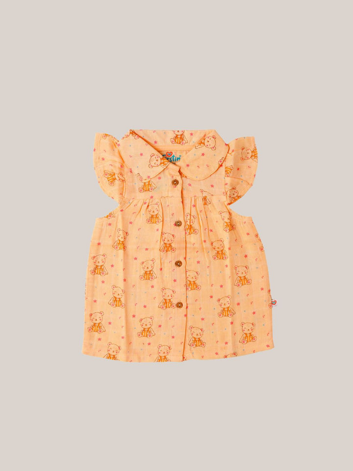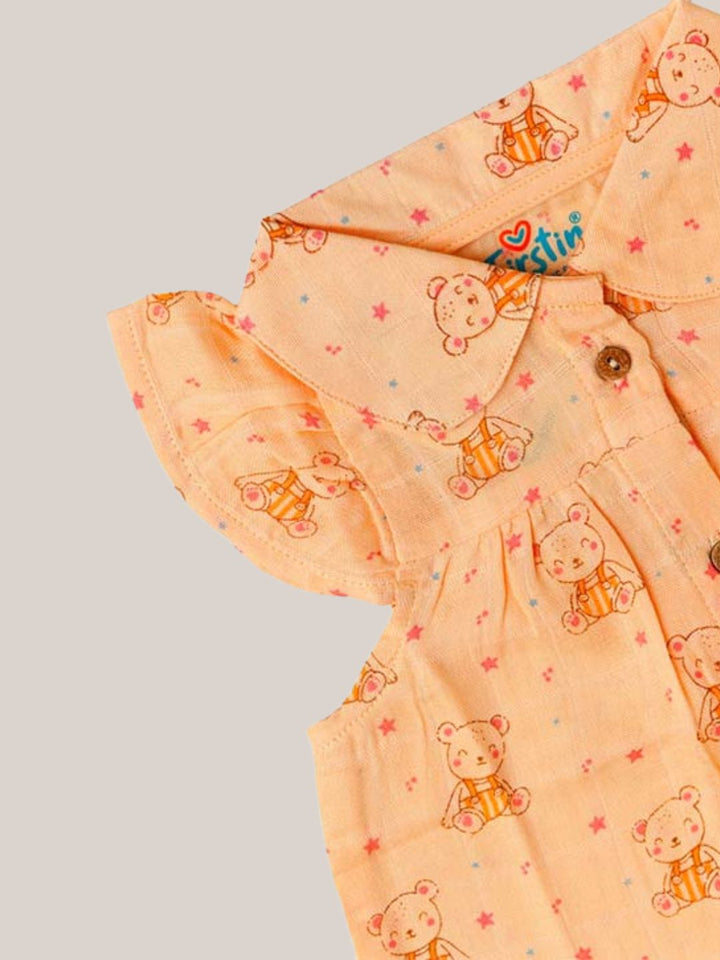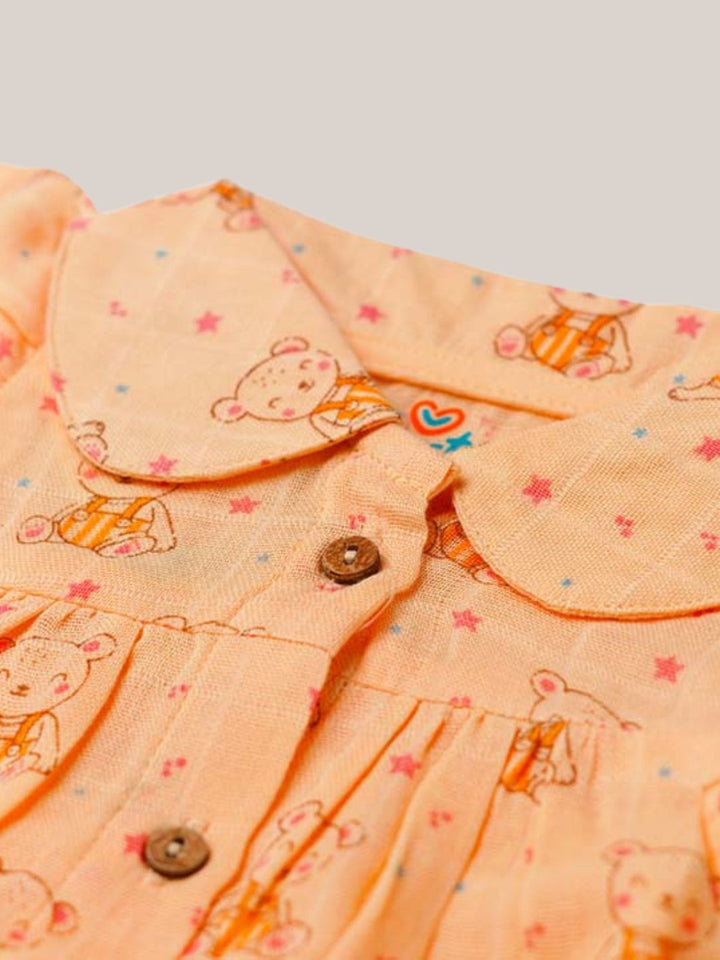 FIRSTIN Muslin Collar Neck Frock - Apricot Sherbet Teddy
