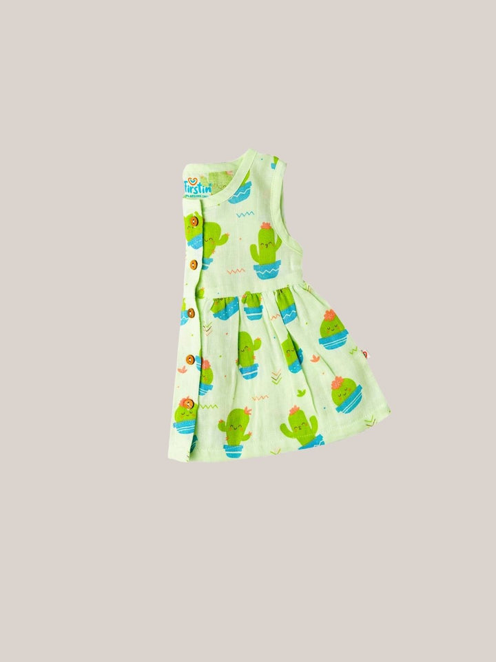 Frock front open (Sleeveless) Crafted from 100% organic muslin cotton, this sleeveless frock is designed for comfort and breathability. The front open button closure ensures easy dressing, perfect for newborns and infants. With a soft and lightweight muslin fabric, it keeps your little one cool and cozy throughout the day. Available in adorable prints and colors.