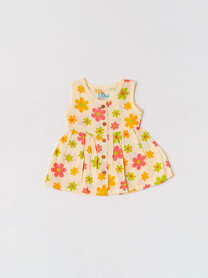 Frock front open  (Sleeveless) Crafted from 100% organic muslin cotton, this sleeveless frock is designed for comfort and breathability. The front open button closure ensures easy dressing, perfect for newborns and infants. With a soft and lightweight muslin fabric, it keeps your little one cool and cozy throughout the day. Available in adorable prints and colors.
