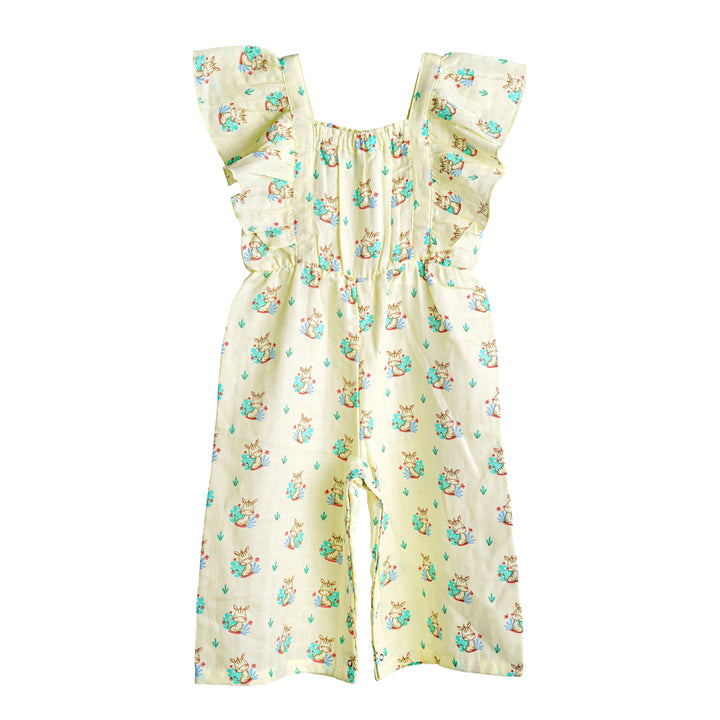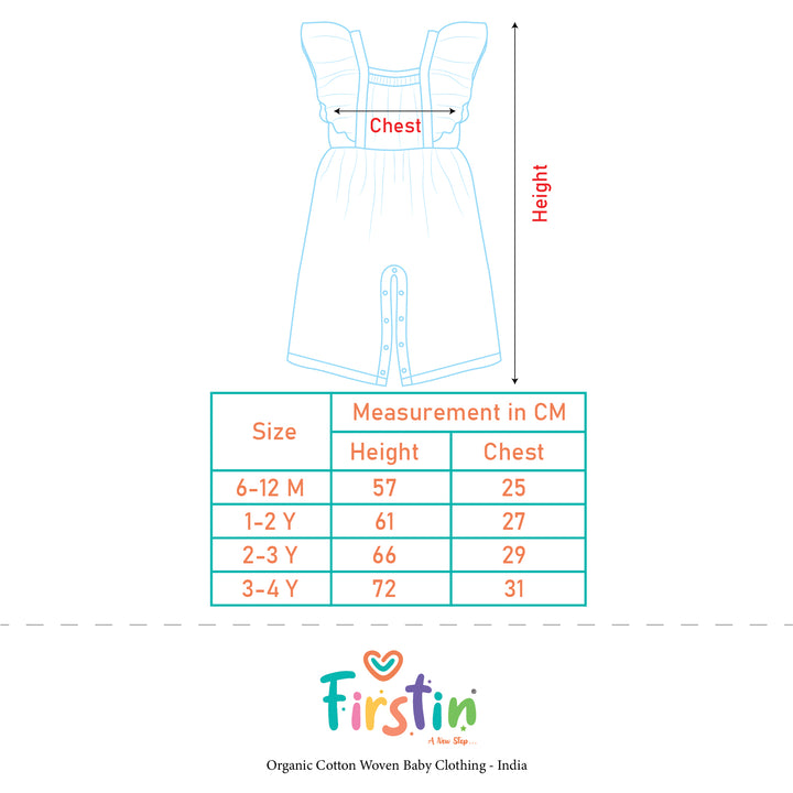 Keep your little one cool and comfy with the FIRSTIN Muslin Palazzo. Made from ultra-soft, breathable muslin cotton. The ruffled shoulder straps add a cute, playful touch, while the gathered elastic waist ensures a snug and flexible fit. Designed with bottom snap buttons for hassle-free diaper changes or potty breaks, it’s perfect for both playtime and outings.