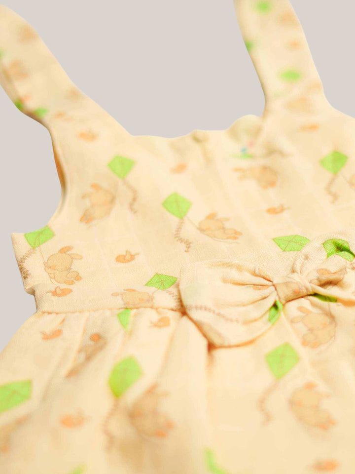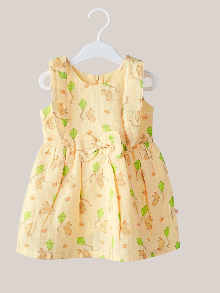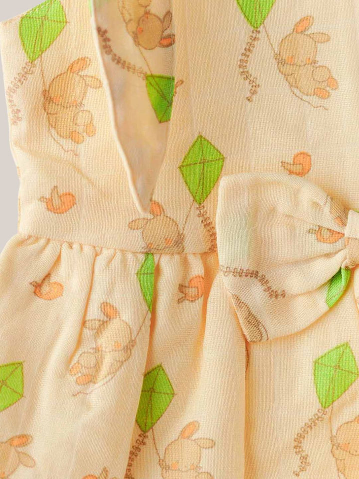 FIRSTIN Muslin Vannila Bunny Kite Self Knotted Frock With Bow
