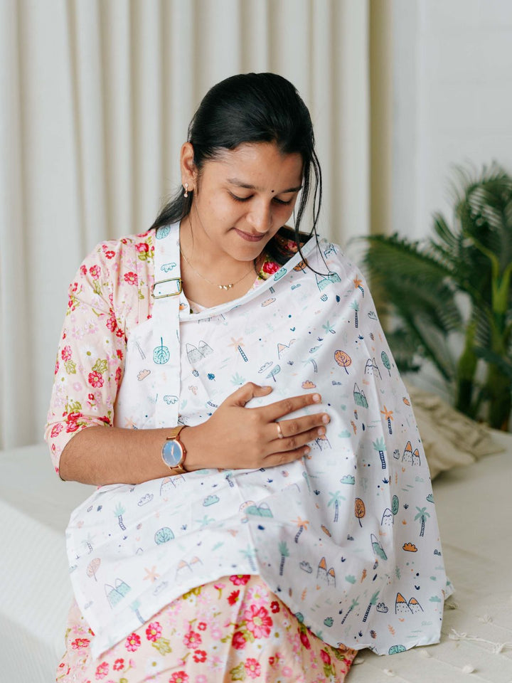 The FIRSTIN Printed Poplin Feeding Apron designed to make feeding time easier and more enjoyable for both mom and baby.