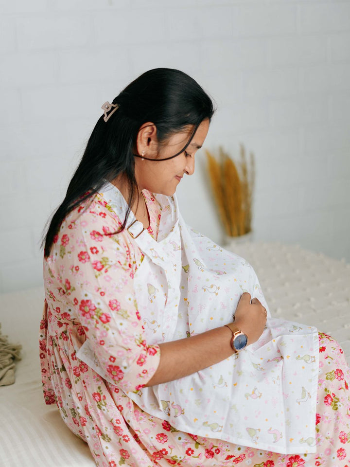 The FIRSTIN Printed Poplin Feeding Apron designed to make feeding time easier and more enjoyable for both mom and baby.