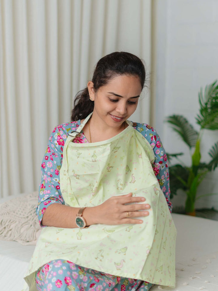The FIRSTIN Printed Poplin Feeding Apron designed to make feeding time easier and more enjoyable for both mom and baby.